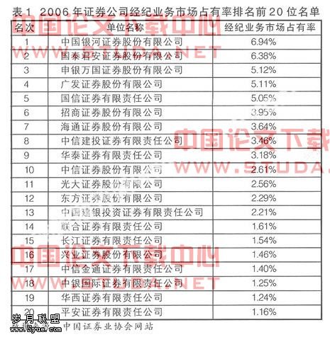 证券经纪业务经历了快速的发展,市场集中度有了一定的提高。2006年证券公司经纪业务市场占有率排名前20位名单(见表1),2006年前20位证券公司经纪业务市场占有率已经达到62.16%,但证券经纪业务的同质性也造成了国内市场竞争仍然非常激烈,尤其在国际大券商纷纷进入国内市场,凭借自身雄厚实力瓜分优质客户的严峻形势下,国内证券公司只有加快兼并重组步伐,扩大公司经纪业务市场占有率,才能通过规模效应降低企业运营成本,为公司提升服务质量留下空间,实现长远利益最大化;才能在竞争中取得较为有利的竞争地位。