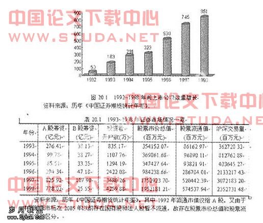 证监会成立后,股票发行试点走向全国。在市场创建初期,各方对证券市场的规则、自身权利和义务的认识不足,为了防止一哄而上,由股票发行引起投资过热,监管机构采取了额度指标管理的审批制度,具体做法是将额度指标下达至省级政府或行业主管部门,由其在指标限度内推荐,再由证监会审批企业发行股票。1992~1998年间我国上市公司数量如图20.1所示,证券市场情况如表20.1所示。