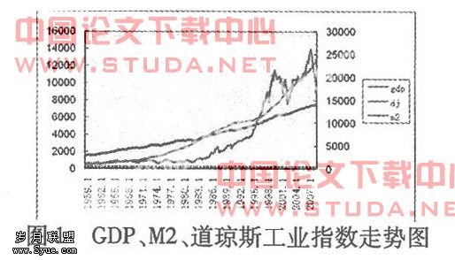 摘取美国自1959年到2008年的道琼斯工业指数(DJ),国民生产总值(gdp)以及M2的数据,得出图1。可以看出除国民生产总值保持稳定增长外,道琼斯工业指数与M2变化大致分为三个阶段。