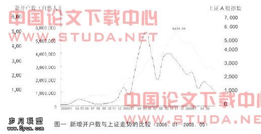(注:图中上证A股指数线表示的是上证A股指数的五日均线图。新增开户数是表示上证A股的月新增开户数,通过EXCEL处理得到图中曲线。A股指数线是由大智慧软件所得;新增开户数据来自中国证券统计年鉴。来源:中国证监会。)