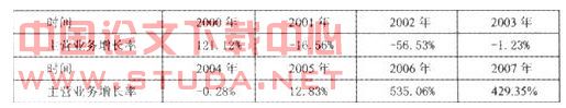 1.主营业务收入受市场影响大。具体表现在当证券市场繁荣时,收入增长极快,主营业务以及利润均以较高比例增长;当证券市场萧条时,收入增长缓慢,与繁荣期增长差距极大,甚至出现负增长。下表是中信证券2000年到2007年主营业务收入增长率: