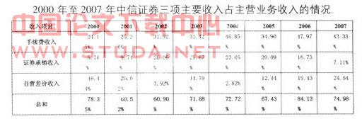 2000年至2007年中信证券三项主要收入占主营业务收入的情况