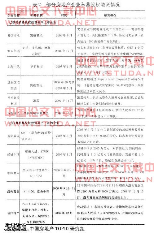 近年来,房地产市场得到海外投资者的广泛关注,美林、雷曼兄弟、德国房地产投资银行、英国Grosvenor、美国凯雷、摩根斯坦利、淡马锡等国际机构纷纷投资中国市场。近年来,中国房地产企业通过项目融资、Pre-IPO等方式引进私募股权融资的案例不断出现,为企业带来的丰富的资金,下表为近年来部分房地产企业私募股权融资情况: