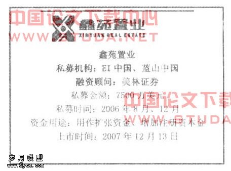 鑫苑置业于2006年8月引入私募投资者,是其开始于2006年3月筹备在美国上市计划的重要一步。2006年前,鑫苑置业主要集中于河南省内发展,土地储备也不大。2004年和2005年,鑫苑置业的土地储备面积分别为226万平方米和305万平方米,2006年由于开工面积急剧增加,土地储备面积迅速减少,更加大了企业计划上市的难度。为了尽快扩大土地储备、加快跨区域发展步伐,鑫苑置业急需要资金,而2006年正是政府为抑制房地产市场过热,出台各项调控政策的一年,融资渠道非常有限。在此条件下,私募股权融资为鑫苑置业提供了新的选择。不但为达到美国资本市场的上市门槛提供了支持,也解决了当前资金压力,为企业进一步发展奠定了基础。2004年和2005年,鑫苑置业的总资产分别为58192万元和86411万元。资产负债率分别为89.47%和79.75%,私募股权融资以前,资产负债率处于较高水平,企业的财务风险较高,不利于企业上市融资。