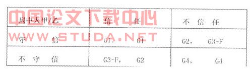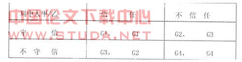 该模型展示了两种不同的情形:情形一:开始甲乙分别选择守信和信任,此是双方都得到G1的收益。此情形将一直延续到一方改变初衷。此时不守信(不信任)方得到G3-G2的超额收益,而守信(信任)方只能得到G2的收益,收益差的存在将导致双方都选择不守信(不信任),各得G4的收益。情形二:甲乙一开始都选择不守信、不信任,这时达到纳什均衡,各得G4的收益。该博弈处于稳定状态,并将持续下去。