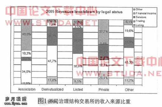 从交易所自身运营来看,通过上市,证券交易所控制成本和提高收入的能力也大幅提高。据世界交易所联合会对其会员统计,2005年,上市证券交易所收入占所有证券交易所收入比重为49%,而成本占总比为43%,股份制但未上市的证券交易所收入占总收入的20%,费用同比只占14%,传统证券交易所收入占总比31%但费用却占了41%。 随着收入的增加,上市交易所收入结构也得到改善,最显著的就是提高服务性收入比例,增加了收入的稳定性,而传统交易所最稳定的收入来源仍然是交易费用收入,在竞争的环境下,单笔交易佣金将趋于下降,交易费用收入也不再稳定,从长期来看必然越来越低,不利于以交易费用为主的交易所。在盈利的压力下,上市交易所在提高收入的基础上大力开展服务性项目,增加相对稳定的服务性收入的比重,优化收入结构。在2005年世界交易所联合会对不同类型会员交易所各项收入来源比重的比较中,市场化程度和服务性收入比重呈正相关,市场化程度越高的交易所,服务性收入占总收入比重越高,上市交易所的服务性收入占其总收入达到39.2%,其次是完成公司制改造但尚未上市的交易所(28.7%)和私营有限公司(23.4%),会员制交易所最低,仅仅只占5.8%。从图1可以看到,上市交易所的服务性收入(39.2%)已经超过了交易费用收入(38.9%),收入更加稳定,而市场化程度最低的会员制交易所收入主要来源于极不稳定的其他性收入。