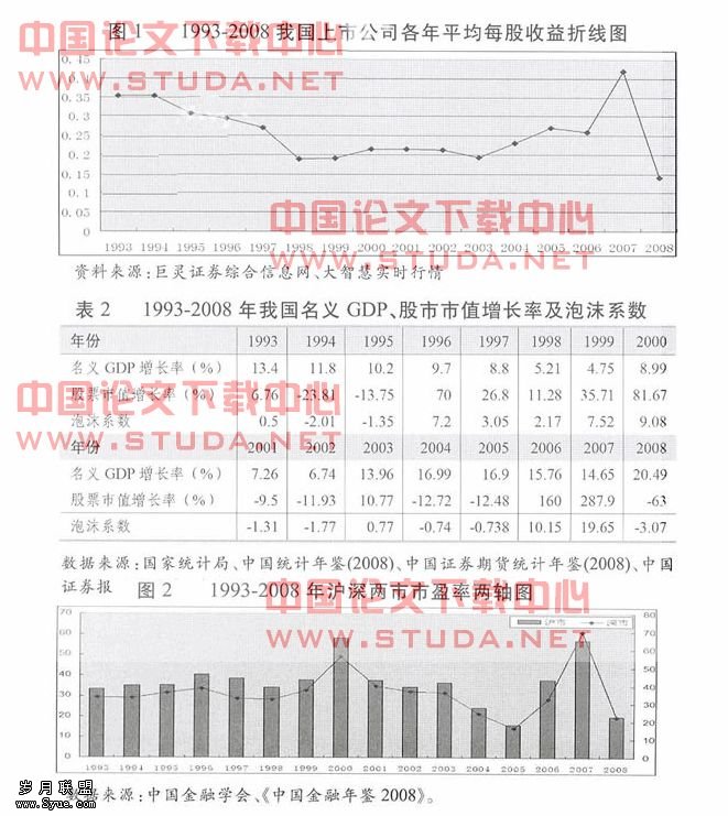 从上市公司的基本面看,中国上市公司质量参差不齐,部分公司虚假“包装”上市;更为普遍的是,上市后的公司整体质量呈下滑趋势,由此加剧了股市泡沫的形成和膨胀。首先,直到2001年3月,即已在证券道路上行走十余年后,中国证券市场才采取由主承销商推荐的做法,公司上市融资制度才得以完善。其次,在政府对上市公司进行审核制度和审批制度下,一直存在着计划经济的调控色彩和审批制度本身的缺陷,难以避免地方政府和寻租和弄虚作假现象的发生。最重要的是,我国上市公司业绩相当不稳定。上市公司每股收益从1993年的0.33元,降低到2003年的0.20元,随着大牛市的发展,2007年每股收益达0.42,2008年又回落到0.34;净资产收益率1993年为13.86%,2003年降到7.41%,2007年回到14.71%,2008年又下降到11.79%。据WIND资讯统计,2004年上市公司亏损数达到174家,2005年亏损数量进一步上升到181家,而2008年亏损数量比2007年几乎翻番。