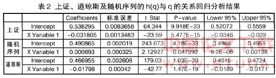 对上证、道琼斯及随机序列的h(q)与q的关系分别作线性回归分析,结果如表2。