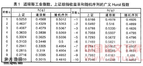 从表1可以看出,当q从负10变到正10,上证的h(q)从0.7946递减为0.2633,而道琼斯的h(q)从0.6248递减为0.3015,随机序列的h(q)则在0.4791~0.5067之间变动。