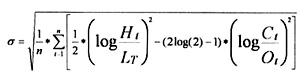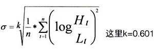 在上式中,r表示收益率指标。另一个被称为(high/low estimator)HL估计量,它使用了每天的最大值与最小值来测度易变性指标。这些极端值是非常有用的,因为它包含了一个时段内证券运动的额外信息,这些信息用CC估计量很少能捕获。估计量的形式是: