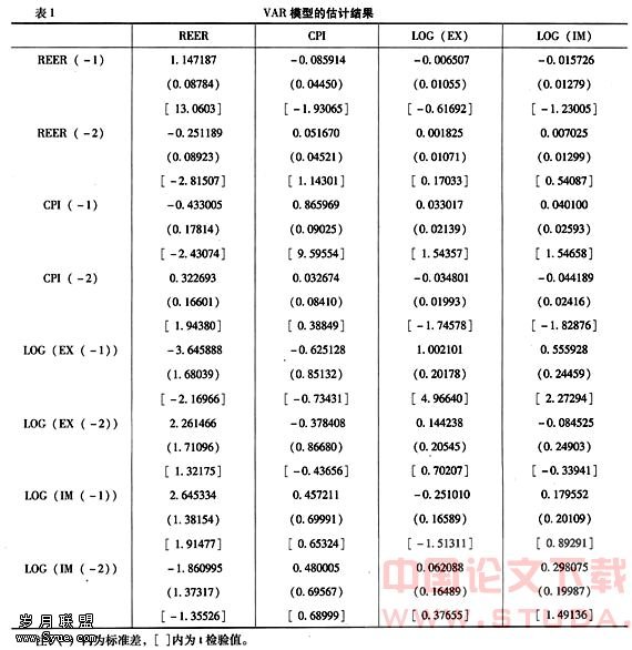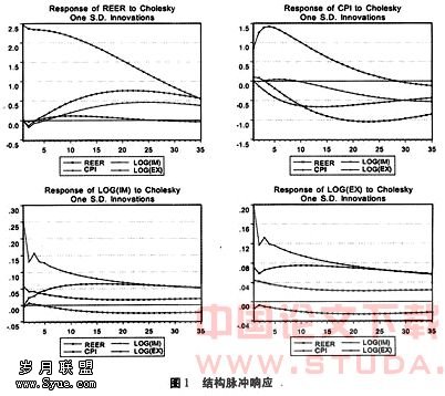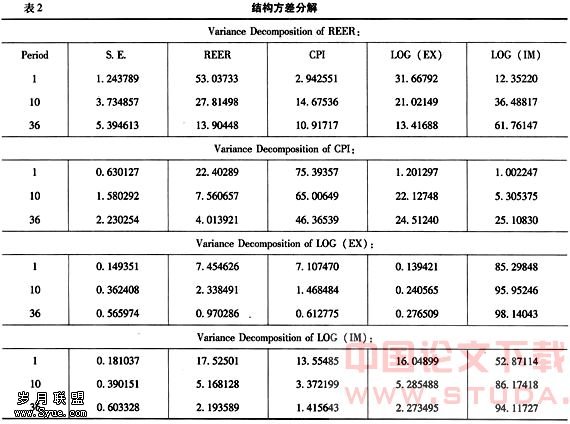 表1显示,实际有效汇率与消费物价指数由最初的反向作用,经过一段时间后变化为同向作用,同时物价指数的变化也存在着与实际有效汇率相同的变化趋势,由最初的反向转为同向,但物价对汇率反应很小。考虑到一国货币的对内价值决定对外价值,因此,在汇率与物价相互作用的过程中,出现了一种不对称现象。另一方面,汇率对出口的影响比对进口的影响大,对出口而言,存在着一段时期的滞后效应,之后与汇率表现为同向作用,这与理论相吻合;同时进口具有刚性,所以其变化程度相对较小。进口对汇率的影响比出口大,方向均是由反向变为同向的。从短期来看,汇率与物价的相互作用方向是相反的,也就是说,如果汇率有一个正向的变化,物价却出现一个反向的响应:国内物价的上升F,即处于通货膨胀状态,而汇率下降,即人民币对外却升值了。