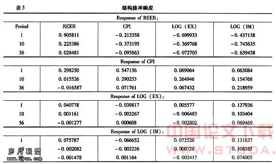 表2列出了第1、10和第36期的各变量变动相互之间的贡献程度,通过对汇率的方差进行分解,可以考察其他变量的方差对汇率方差的贡献度:出口对汇率冲击的贡献率最大达到31.67%,其次是进口12.35%,而第1期的国内物价的贡献率却只有2.94%,到第36期,进口和物价对汇率冲击的贡献率是逐步上升的,出口相对下降,也就是说,在这一过程,汇率更容易受到来自国际市场的影响。就物价而言,在受到一个来自汇率的冲击后,物价的反应最大,汇率对物价的贡献率达到22.40%,这比物价对汇率的贡献率2.94%大的多,而同期的进出口的贡献率各自只有1%左右,时间越往后效应越明显。出口在受到汇率和物价的冲击后受其作用的贡献度都比较大,同时进出口在受到汇率和物价的冲击之后随着时间的延长,贡献率会逐步的衰减。可以认为,汇率对物价变化的反应是很迟缓的,但物价对汇率变化的反应相当灵敏,时间递延期限越长表现越明显。鉴于这种状况,我们利用(5)式中的SVAR模型的脉冲响应函数(impluse-response function)来考察变量之间结构冲击效应,结果如表3和图1所示。