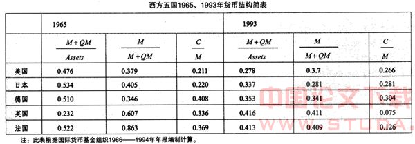 表中数据表明,20世纪60年代以来,各国的通货与货币之比都有下降的趋势,发达国家的c/M之比从平均0.309降至 0.224,而货币占广义货币的比率(M/M+QM)也从平均0.661下降到了0.316。金融创新的发展大大加快了货币的流通速度,使得人们对货币的交易需求大大下降。