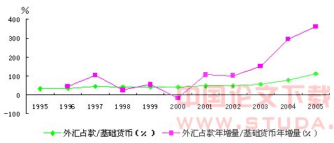 一是导致基础货币的非自主性投放。我国投放基础货币主要有三个渠道:广义的央行贷款、财政透支与借款和外汇占款。20世纪80年代中后期,外汇占款对基础货币的影响并不明显,外汇占款占基础货币的比例都在6%以下,最低时只有1.24%。但自1994年我国实行外汇体制改革以来,国际收支持续顺差,在有管理的浮动汇率制度下,为维持既定的人民币汇率或将汇率波动控制在一定的范围内,中央银行被迫在外汇市场上吞进国际货币来抵御影响汇率稳定的外部冲击,增加了基础货币的非自主性投放。我国中央银行基础货币投放的结构发生了根本性的变化,外汇占款成为基础货币投放的主渠道。近几年外汇占款存量占基础货币存量的比重逐年上升,由1995年的32.6%增加到2005年的111.3%;自2001年以来外汇占款年增量占基础货币年增量的比重都超过了100%,2005年这一比例更是达到了361.98%。由外汇储备增加形成的外汇占款成为现行汇率制度下中央银行无法控制的内生经济变量,中央银行在运用货币政策工具调控货币供应时,常常会产生“能量分散”或“能量对冲”,货币政策的自主性和有效性大大削弱。