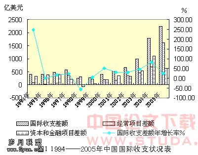 近年来,随着我国国民的持续快速健康,国际收支规模不断扩大。1994—2005年间,我国国际收支差额的年均增长率为16.9%,且除1998年资本和项目出现过63.2亿美元的逆差外,其余年份均出现经常项目与资本和金融项目的“双顺差”。2005年我国国际收支顺差为2237.82亿美元,较上年增长24.8%,占GDP的9.82%。其中,经常项目顺差1608.18亿美元,占国际收支总体顺差的71.86%;资本和金融项目顺差629.64亿美元,占国际收支总体顺差的28.14%(见图1)。