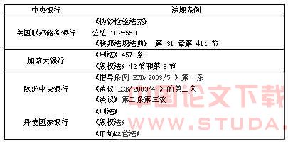 对货币图样的管理,各国均在本国多部中作了规定(见表1)。这些法规条文并不是空泛的,而是对货币图样的制作标准、使用条件、申请程序作了详细的规定,如欧洲中央银行《指导条例ECB/2003/5》的第一条提出了界定违规复制货币图样的标准,《决议ECB/2003/4》的第二条提出了界定非法复制的标准,《决议》第二条第三款提出了界定合法的及无需许可即可进行复制的标准。[1]