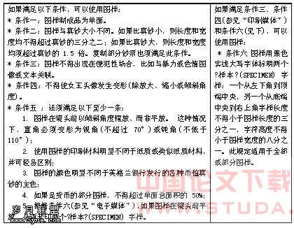 随着科技的迅猛,犯罪分子制造假钞的方式和手段也日新月异。不少犯罪分子通过货币图样就能达到其制作假钞或校正假钞的目的。因此,各国央行对货币图样的制作和使用作了严格细致的规定。除要求使用者必须向中央银行提出书面申请外,对货币图样的分辨率、长度和宽度、颜色、防伪标志、样本标志都有具体要求。其中,英格兰银行的货币图样使用条件比较具有代表性(见表2)。