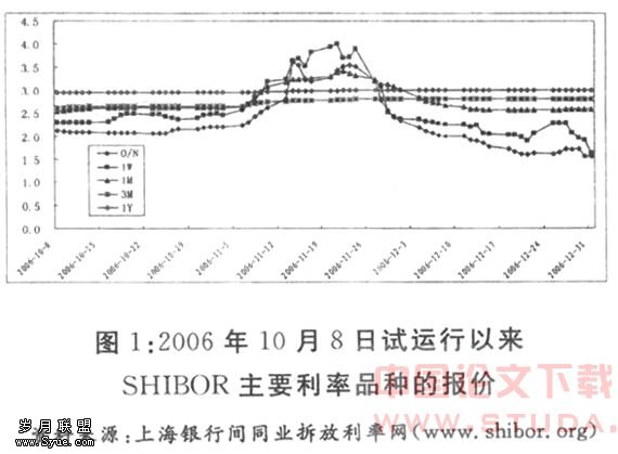 图1是2006年10月8日到12月31日SHIBOR试运行期间主要利率品种的报价,可以看出,SHIBOR的短期利率如隔夜和一周的期限波动较大,而较长期限的如3个月和1年的利率则相当平坦,基本上是一条直线。