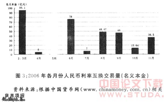 1.交易量的月份分布。从2006年2月10日至11月底,人民币利率互换市场成交的名义本金为327.7亿元。从图3来看,各个月份成交量的波动较大,其中5月份没有成交,同时,月份间没有表现出明显扩大的趋势,反映出市场还不成熟。