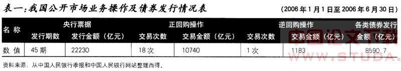2006年,为防止经济增长过热,中央银行坚持稳健的货币政策,开始逐步采取紧缩的措施,包括一次上调贷款利率、两次上调银行准备金率和加大公开市场操作。截至6月末,广义货币(M2,即社会流通货币总量加上活期存款以及定期存款与储蓄存款)余额为32.28万亿元,同比增长18.43%。公开市场业务操作的具体情况如表一所示。