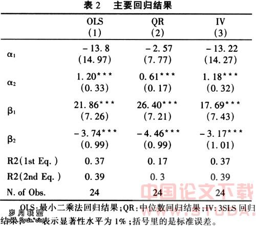 首先,我们的回归只使用了24个观测目标,由小规模样本支持的结论是否反映了真实情况呢?作为对所发现的结果的检验,我们使用中位数回归方法再一次估计方程的系数和标准误差,其检验的结果在表2中的第2列。我们发现系数α2和β2的符号和我们所预期的完全相同。因此我们所得出的结论是符合实际的。