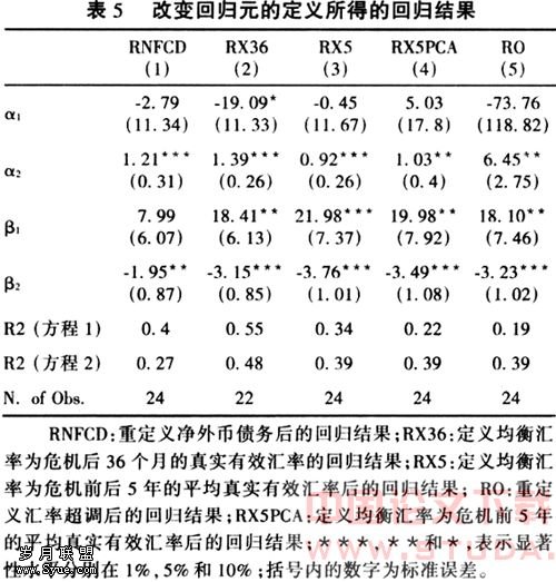 然后,我们再考虑3种不同的均衡真实有效汇率的定义。当我们把均衡的真实有效汇率定义为危机后36个月的真实有效汇率时,α2和β2的符号仍然和预期的符号相同,并且在1%的水平上是显著的。其回归结果在表5第2栏中表示出来。当我们把均衡真实有效汇率定义为危机前3年和危机后两年的真实有效汇率的平均数时,对我们初始模型进行回归,结果如表5第3栏所示,α2和β2的符号和预期的符号完全相同,并且在1%的水平上是显著的,只是α2由1.2变为了0.90。最后,我们把均衡真实有效汇率定义为危机前5年的真实有效汇率,我们这样定义均衡真实有效汇率的原因是:要说明用危机后的数据来定义均衡真实有效汇率是否有内生性的问题。即,我们的模型中的一个自变量是否内生于我们的模型中。这种情况在理论上是可能的。例如,一定程度的汇率超调、净外债规模或者是产出下降,在危机的初期可能会引起政策的改变,从而改变均衡真实有效汇率。如果是这样,我们得出的结论将会是无效的。要使我们的模型是可识别的,模型中的两个变量:净外币债务和基本贬值,必须是外生的。当我们把均衡真实汇率用危机前的数据来表示时,则说明基本贬值并不由货币危机来决定。根据这个定义重新进行回归的结果,如表5第5栏中所示,我们的结论仍然得到支持。