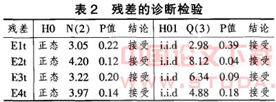 从上表可以看出,所有残差在0.05的水平上服从正态分布的,只有ε2t存在着一定程度的自相关性。但是由于其3阶自相关仅为-0.04,这是个可忽略的数值,我们将视其为无自相关即不严格的独立性。所以从总体上说,残差通过诊断检验,因此,以下我们可基于VAR(2)作因果关系检验。