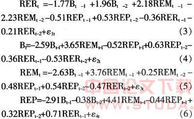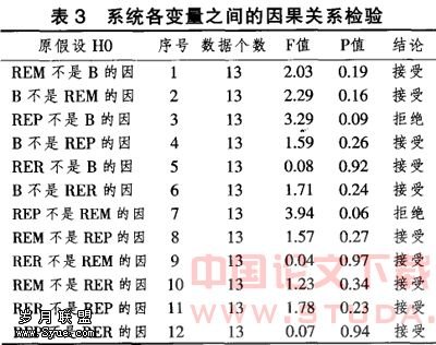 F值显然小于对应的临界值,接受原假设。贸易差额的变动率B不是汇率变动率RER的因。对其他变量之间的因果关系可类似地实现,其结果一并列入下表,其中的结论是基于显著水平0.10。