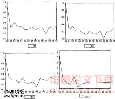 上表中,我们可以看到,对原假设5和6的接受表明在10%的显著水平下,原假设“B不是RER的因”和“RER不是B的因”的F统计量均小于临界水平,汇率的变动RER和贸易余额B之间不存在因果关系。也就是说,通过单纯的变动人民币汇率对中美之间贸易差额的影响不大。同时我们注意到,对于原假设7的拒绝,表明在我国出口的变动是造成进口变动的一个原因,出口在一定程度上能够带动进口的增长。这在一定程度上解释了我国外贸依存度较高的原因。而对于原假设3的拒绝,表明出口变动是贸易余额的成因。这说明我国存在着一些促进出口的因素导致中美贸易差额的加剧。正如下文分析可知,这些因素主要是两国之间的劳动生产率的变化率和储蓄方面的差距,而这些差距是造成中美贸易差额的主要原因。