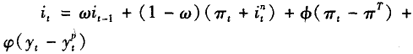其中,y—yp代表产出缺口,π代表每季度末的通货膨胀率,πT代表目标通货膨胀率,ω、φ和φ为参数。