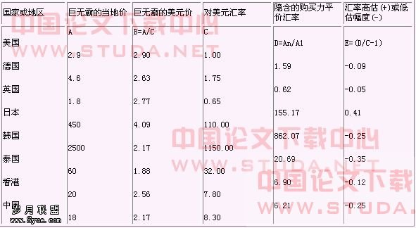 [应用购买力平价模型]:各国麦当劳巨无霸价格的比较及与现行汇率的比较:判断现行汇率是高估还是低估实际汇率(高估 – 名义汇率高于隐含的购买力平价汇率;低估 – 名义汇率低于隐含的购买力平价汇率)。