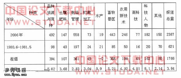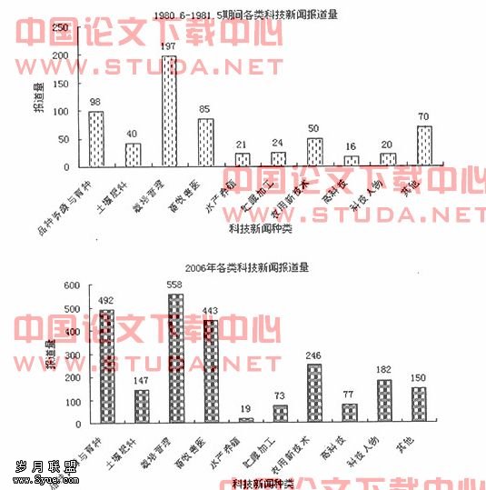 研究发现,两时期的科技新闻报道量有较大悬殊。1980.6-1981.5期间科技新闻的年报道总量只有621条,而2006年的科技新闻有2387条,超出前者1766条,增长了284%。除水产养殖技术外,其余类别的科技新闻年报道总量均有大幅度增长。(见表1)