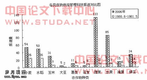从图4可以看到,改革开放初期,小麦、水稻是重点报道对象;而到了新农村建设时期,蔬菜、水果成了明显的报道重点。据研究发现,新时期关于蔬菜、水果栽培管理方面的科技报道中,有较多是关于大棚、温室栽培管理技术方面的,而在改革开放初期这方面的报道比较少。