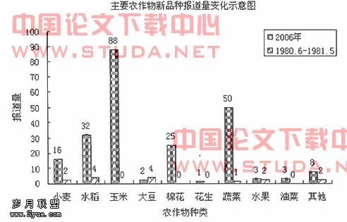 统计还发现,改革开放初期的15条新品种报道中,涉及的农作物只有小麦、水稻、大豆、蔬菜、水果、油料作物。而新农村建设时期报道的新品种种类不仅增加了,而且报道量有不同程度的增长。(见图3)
