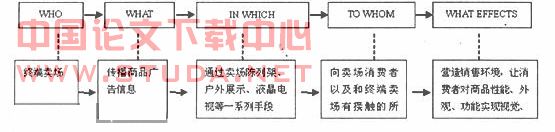 终端的传播场地和传播主体就是其大型卖场或连锁卖场,传播的信息内容就是主要是其卖场内产品的信息,其受众就是终端所聚集的大量人流,传播方式多种多样,包括陈列展示、户外看板、液晶电视等,其传播目的和传播影响就是促成消费者的品牌认知和购买行为。