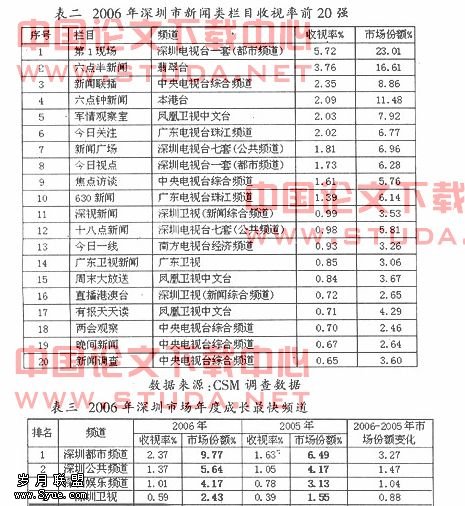 表二为2006年度深圳地区所有频道晚间各新闻节目收视排名。深圳电视台都市频道《第一现场》栏目稳坐市场收视榜首,与榜眼中央台综合频道的《新闻联播》拉开了较大的距离。深圳公共频道的《十八点新闻》和《新闻广场》也进入了前20位。一批新闻节目收视成绩的稳步上升是深圳本土电视业绩走强的重要支柱。在《第一现场》以及《十八点新闻》、《新闻广场》、《深视新闻》和《直播港澳台》的带动下,深圳都市频道、公共频道、深圳卫视成为2006年深圳市成长最快的几个频道(见表三)。