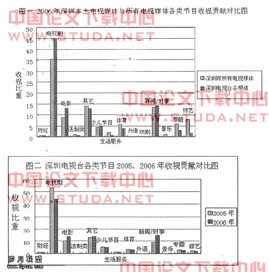 图一清晰地显示出了,与深圳地区所有电视媒体相比,深圳本土电视媒体在新闻时事、电影、少儿节目等方面明显具有竞争优势,而在综艺、专题、、等方面明显不如其他媒体。
