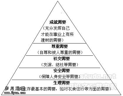 马斯洛1943年发表了他的《人的激励理论》,提出了需求层次理论。这一理论的生动形象的表述如下图: