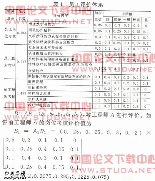我们在对售前工程师建立了(优秀、良好、一般、较差、不合格)5级的初级评价集,并从以下4个方面对其各项指标打分,进行360°评价。?