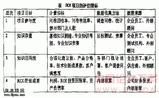 本文结合知识员工的特点,将ROI的评估指标分为项目参与度、知识存量、知识应用度、ROI经营成果等五层指标,各指标的方法和数据来源可列表如下: