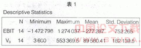 1 人力资本的实际价值V与企业息税前收益EBIT相关性的分析。