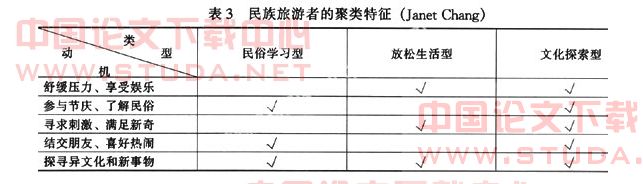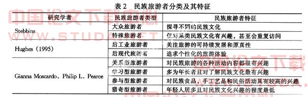 国外对民族旅游者的研究主要围绕心理和行为特征两个方面。Stebbins根据旅游者旅游动机的目的性强弱,把民族旅游者分为大众旅游者和特殊旅游者两类[3]。Hughes(1995)认为民族旅游者具有后和后的两类行为特征。前者对于自己的旅游行为给东道主社会带来的影响普遍具有责任心。后者的旅游行为表现出高度的活跃性和适应性,他们能接受并欣赏其他人造景色,而并不特别在乎产品的真实性[4]。