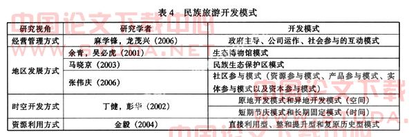 根据不同的研究视角,国内学者主要提出了4种民族旅游的开发模式,详见表4。