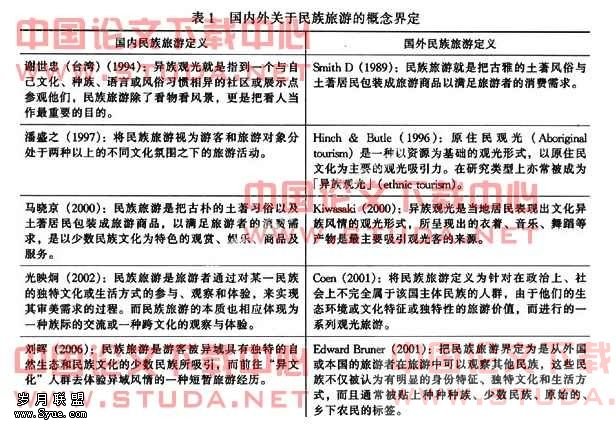 从表1所列出的国内外民族旅游定义来看,民族旅游的特征主要包括:第一,民族旅游所指民族是一国的非主体民族,他们可以是发达国家保护区的土著民族,但更多是指不发达国家和地区的少数民族。少数民族居民作为被游览者,是民族旅游产品的组成部分之一,具有主人和被消费商品的双重身份;第二,民族旅游是一种跨文化的交流形式;第三,从旅游资源的角度讲,它指的是民族地区独特的民族文化和环境,其中民族文化是民族旅游的核心吸引物;最后,由于大多民族地区的经济和社会发展相对落后,民族旅游往往成为民族地区脱贫致富的主要途径。