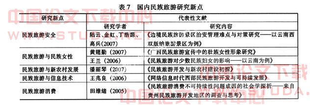 综观国内外关于民族旅游的研究,国外学者在研究领域及研究方法方面,较为广泛和深入。国内学者在多元化和本土化研究方面的新点与热点则更为突出。见表6和表7。