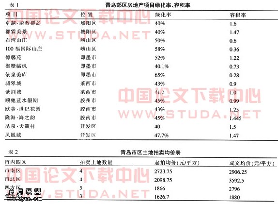 近几年,随着我国房地产业的飞速,我国房地产价格飞涨,尤其是位于大都市中心地区,一般都成为“黄金地段”,价格不断攀升。由于郊区有较大的土地供应量,所以,城市郊区度假型居所的价格相对较低。对2007年6月青岛土地拍卖会的调查可以看出,青岛市中心城区市南区、市北区与处于外围的四方和李沧区土地拍卖价格具有较大差别(如表2)。青岛郊区的房价也是按距市中心距离大小逐级递减的,以开发区为最高达到4 296元/平方米,莱西最低1 874元/平方米,都远低于市区。