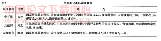 中国幅员辽阔,拥有960余万平方公里国土,多达5400余大小岛屿。东临浩瀚的太平洋,从北向南依次围绕着渤海、黄海、东海和南海。大陆与岛屿海岸线总长3.2万公里。滨海地区是人类活动较频繁且较快的区域,也是的热点地区。中国对滨海区的旅游开展已久,滨海旅游资源基本格局大致形成S形态势,由北向南形成4大旅游带、10大旅游区[4],其中包括大批风光优美的滨海风景名胜区。
