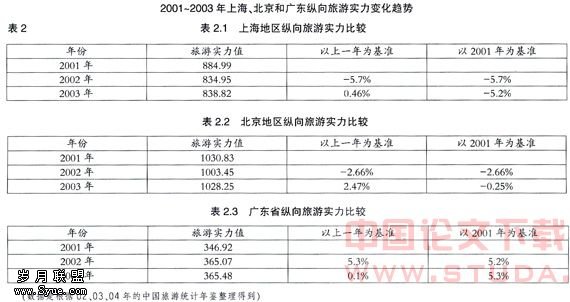 1.关于旅游实力的纵向比较(表2) 纵向比较是将某旅游地区的旅游实力指数按时间排序,通过旅游实力指数的变化来分析该地区旅游发展的实力变化趋势。