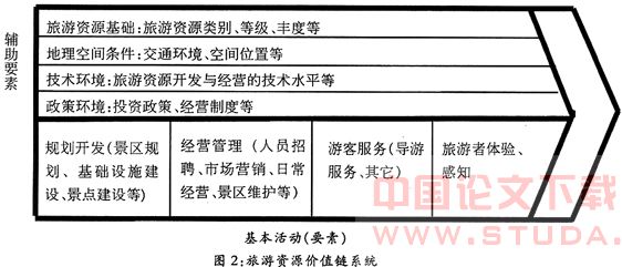 同时,这些辅助的价值要素和基本的价值活动是相互影响的,基本的价值活动立足于辅助的要素环境中,但它也会影响辅助要素环境的改变,辅助要素环境的改变又反过来影响这些基本的价值活动的变化。它们构成旅游资源的价值链系统(如图2)。