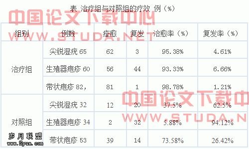 对照组:尖锐湿疣痊愈12例,复发20例,痊愈率37.5%,复发率62.5%;